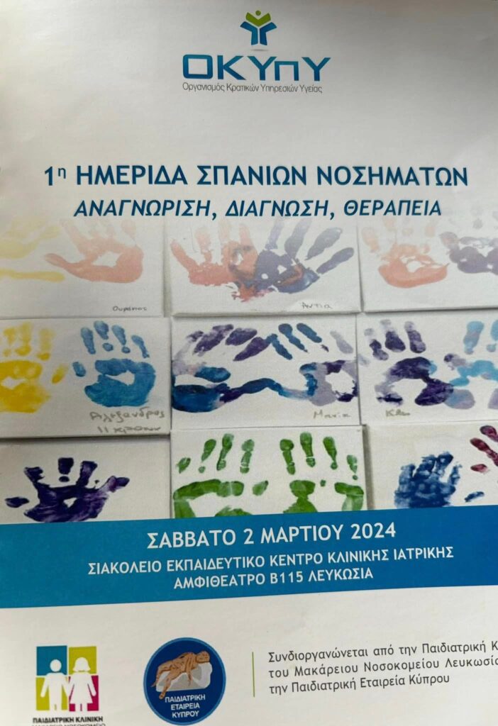 Πρώτη Ημερίδα Σπάνιων Νοσημάτων με θεματική “Αναγνώριση, Θεραπεία και Πρόληψη”, η οποία συνδιοργνώθηκε από την Παιδιατρική Κλινική του Μακαρείου Νοσοκομείου και τον Οργανισμός Κρατικών Υπηρεσιών Υγείας – ΟΚΥπΥ σε συνεργασία με την Παιδιατρική Εταιρεία Κύπρου στο Σιακόλειο Εκπαιδευτικό Κέντρο Κλινικής Ιατρικής του Πανεπιστήμιο Κύπρου | University Of Cyprus.