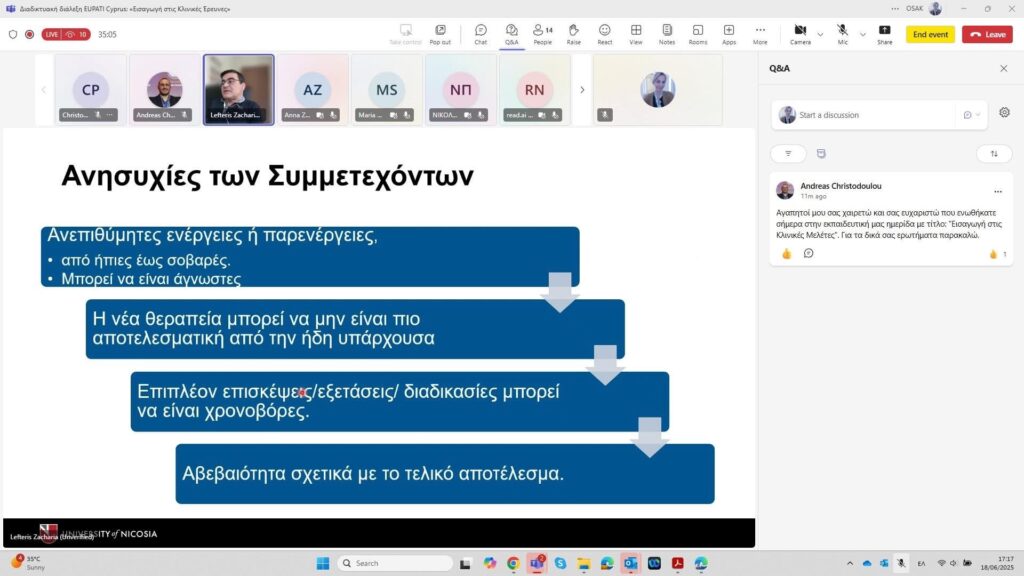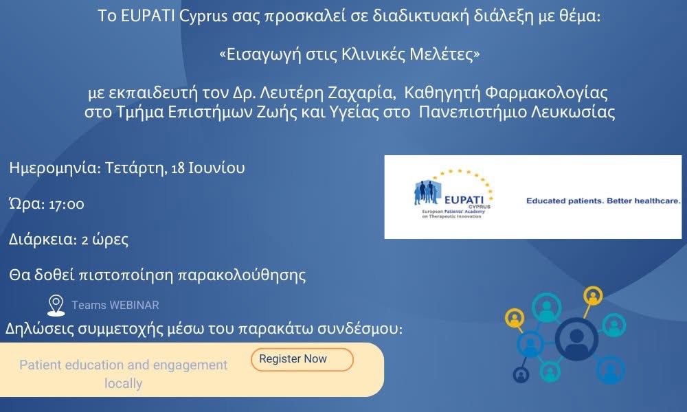 Διαδικτυακή Διάλεξη EUPATI Cyprus -«Εισαγωγή στις Κλινικές Μελέτες»
